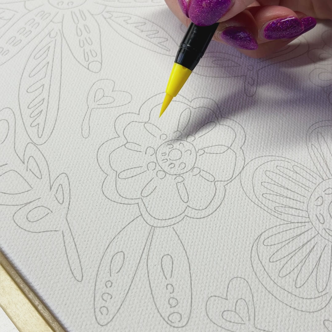 This kit includes a large square-shaped canvas with a beautiful Spring flower pattern outline, ready for you to bring to life with colour. The light grey outlines make it easy to follow, allowing for a relaxing yet rewarding painting experience. Using our smooth, gliding watercolour brush pens, you can complete a stunning artwork that will add colour to any space. Whether you follow the colouring guide or call on your own creativity, this project will leave you with a vibrant masterpiece ready to hang.