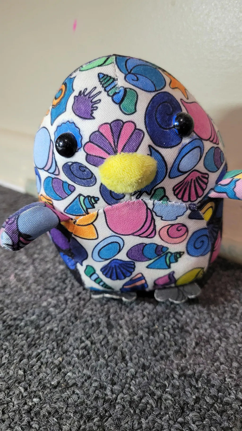 1 x Pebbles the Penguin plush toy with seaside doodle designs in a colourful box